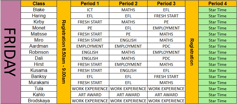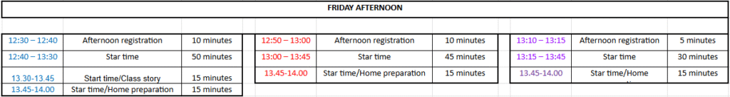 Friday 8.50am – 2.00pm (5 hrs and 10 minutes including free association time)