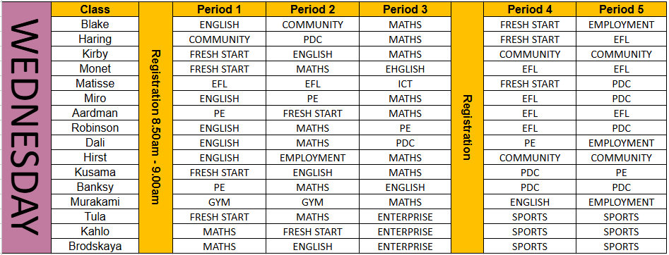 Wednesday 8.50am – 3.00pm (6 hrs and 10 mins including free association time)